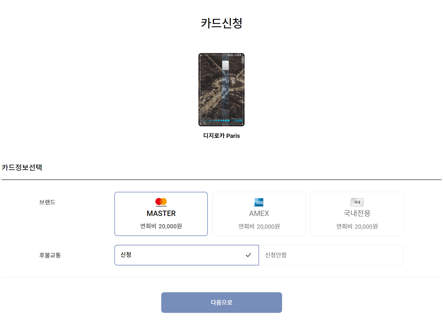 디지로카 파리 신용카드 발급신청 페이지를 이동 하시면 아래와 같은 화면을 확인하실 수 있습니다.