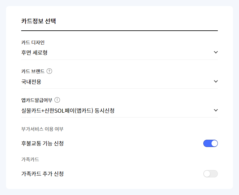 카드 디자인, 브랜드, 앱카드 발급 여부, 부가 서비스, 가족카드 등의 정보를 선택하시고 발급을 진행하시면 됩니다.