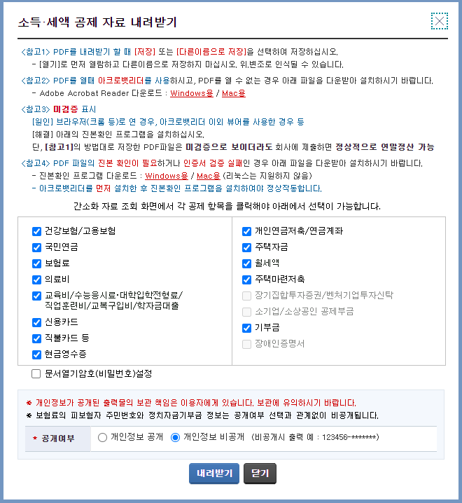본인의 각 공제 항목을 클릭 하시고, 공개 여부를 선택하신 후, 내려받기를 진행하시면 됩니다.
