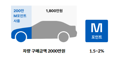 현대자동차와 기아 자동차 구매시 5년간 200만 M포인트 사용 가능합니다.
