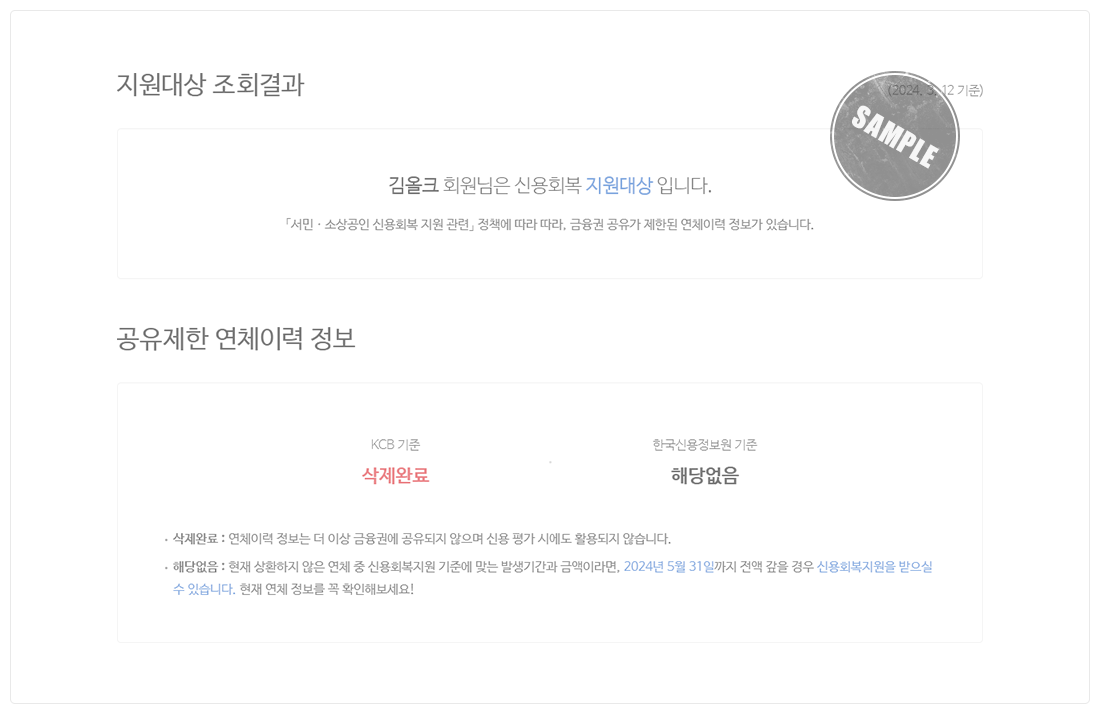 아래는 지원대상 조회결과 샘플의 이미지 입니다.