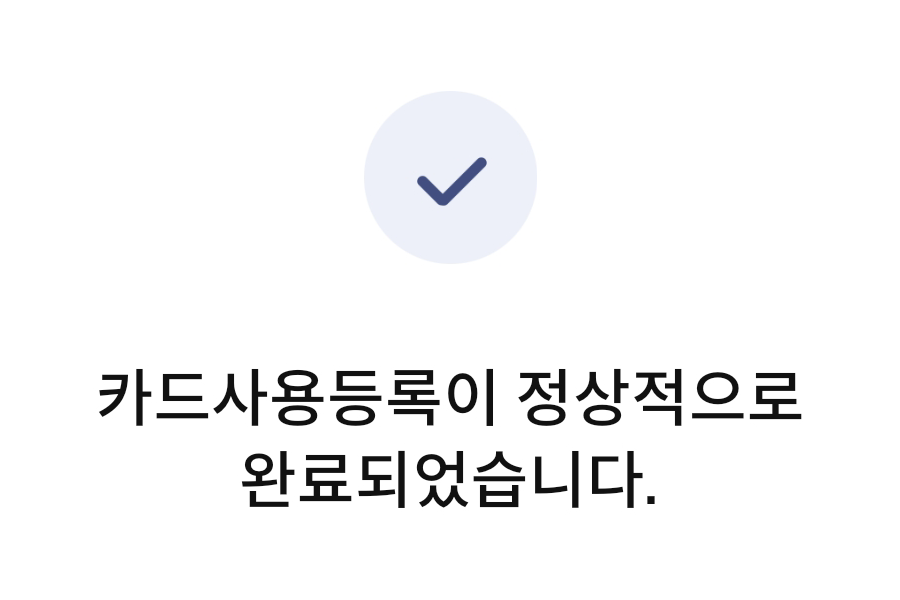 정상적으로 정보를 입력하시고 카드사용등록을 하셨다면 다음과 같은 메시지가 뜨며 완료됩니다.