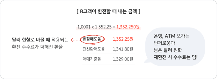 달러를 현찰로 바꿀때 적용되는 환전 수수료가 더해진 환율이 적용됩니다.