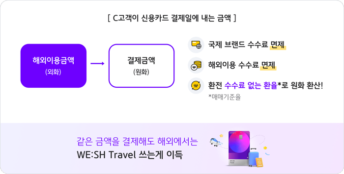 WE:SH travel 카드 결제일에 내는 금액은 국제 브랜드 수수료, 해외이용 수수료, 환전 수수료를 면제받습니다.